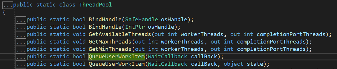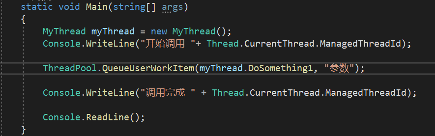 使用线程池ThreadPool类中静态方法QueueUserWorkItem将一个方法(这个方法的参数必须是Object类型,且无返回值)添加到线程池的执行队列中,线程池调度空闲的线程去执行队中的方法。