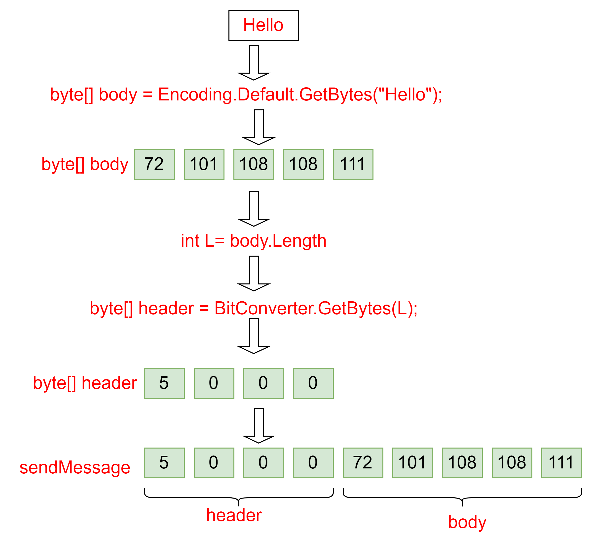 发送方发送消息时,首先获得消息的长度数值L,然后将L转换为4个字节的数组,将这个数组加到消息体前,形成一个新的字节数组发送。