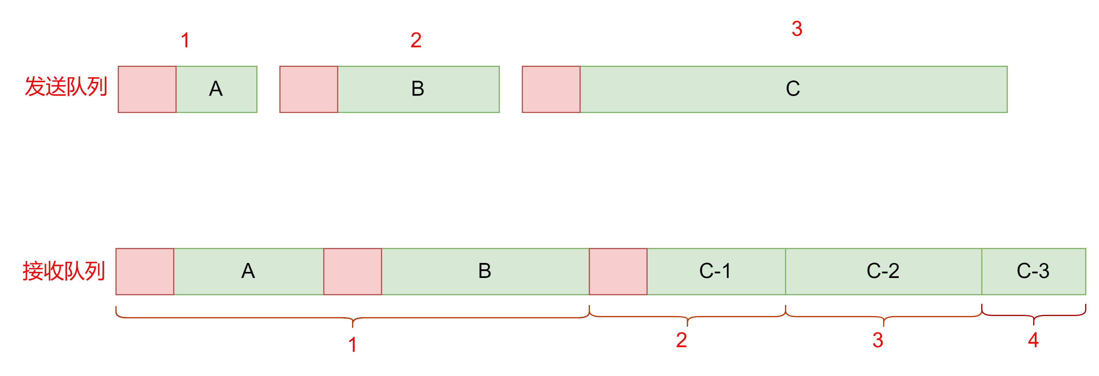 假如发送队列中有3个数据待发送,到达接收缓存队列中可能是下图显示的样子。