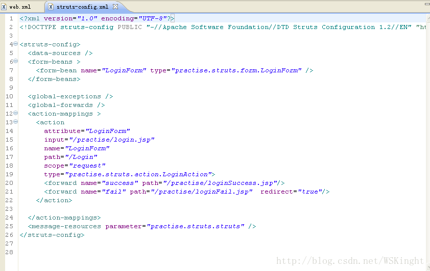 再检查struts-config.xml。确认是否有<form-beans>和<action-mappings>,类似下图: