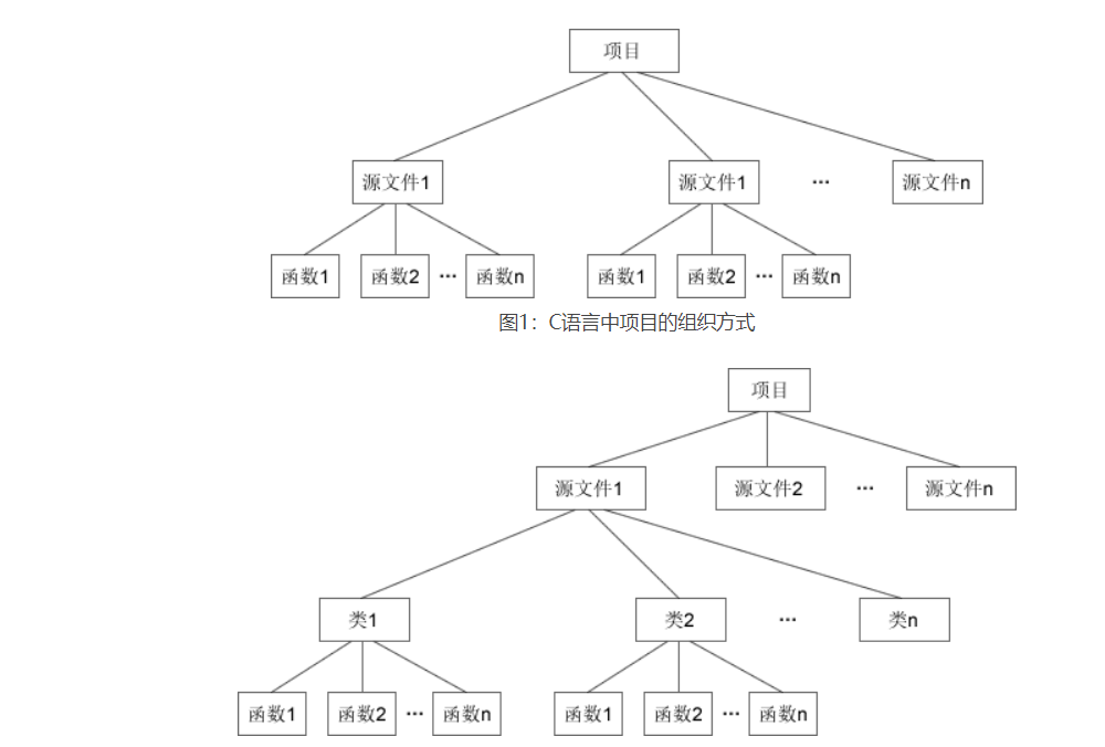 而在 C++ 中,多了一层封装,就是类(Class)。类由一组相关联的函数、变量组成,你可以将一个类或多个类放在一个源文件,使用时引入对应的类就可以。下面是C和C++项目组织方式的对比: