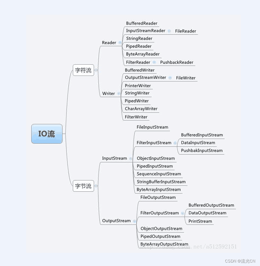 • 节点流:可以从/向一个特定的IO设备(如磁盘,网络)读/写数据的流,也叫【低级流,主要由】