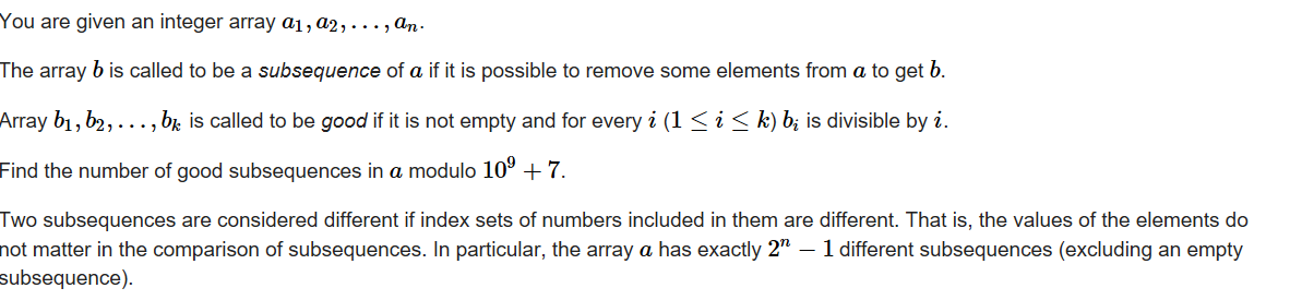 dp[i - 1][j] + dp[i - 1][j - 1] & (a[i] \% j == 0)\\
