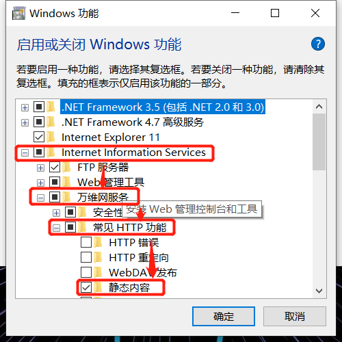 打开电脑的控制面板,选择程序--------启用或关闭WINDOWS功能--------------Internet Information Services------------------万维网服务-----------------常见HTTP功能---------------勾选静态内容就可以了。