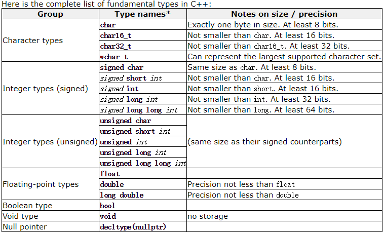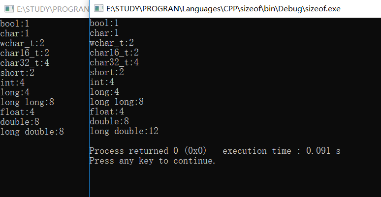 #include<uchar.h> #include <iostream> using std::cin; using std::cout; using std::endl; int main() { cout << "bool:" << sizeof(bool) << endl; cout << "char:" << sizeof(char) << endl; cout << "wchar_t:" << sizeof(wchar_t) << endl; cout << "char16_t:" << sizeof(char16_t) << endl; cout << "char32_t:" << sizeof(char32_t) << endl; cout << "short:" << sizeof(short) << endl; cout << "int:" << sizeof(int) << endl; cout << "long:" << sizeof(long) << endl; cout << "long long:" << sizeof(long long) << endl; cout << "float:" << sizeof(float) << endl; cout << "double:" << sizeof(double) << endl; cout << "long double:" << sizeof(long double) << endl; return 0; }