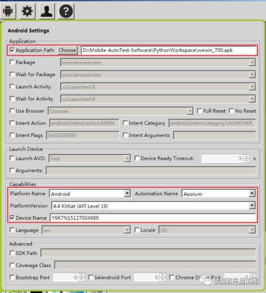 按照如上步骤安装好各软件后,基本环境就算完成了。启动Appum,填写被测APP路径,Platform选Android,Automation Name选Appium,PlatformVersion根据手机的Android版本选择,DeviceName选择上面adb命令识别的手机udid号;Server地址和端口保持默认: