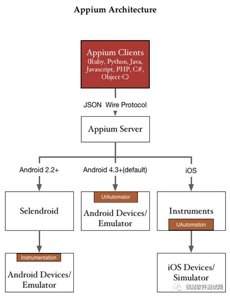2.3 Appium Server/ClientAppium Server即服务器,连接Appium客户端和移动设备。原生的webdriverapi为web端设计,因此扩展到移动端要拓展。Appium官方提供了一套appium client,涵盖多种语言ruby/java/python等。
