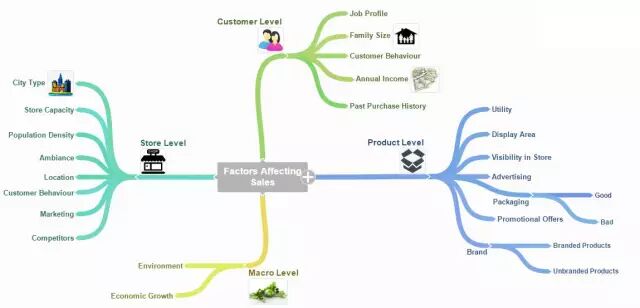 下面是一张简单的思维导图,我在这张图中展示了可能影响产品销量的因素。