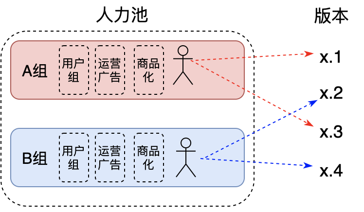 后来我们经过内部研究,提出了AB分组的方案,保证AB组是隔版本进行开发。当组内需求拆分有冲突时,需要在内部协调消化,避免RD出现每个版本都会参与开发的情况发生。