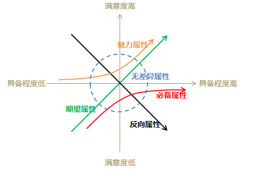 - 必备属性:当优化此需求,用户满意度不会提升,当不提供此需求,用户满意度会大幅降低;