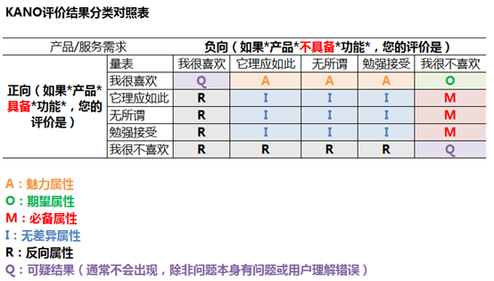 KANO问卷对每个质量特性都由正向和负向两个问题构成,分别测量用户在面对存在或不存在某项质量特性时的反应。
