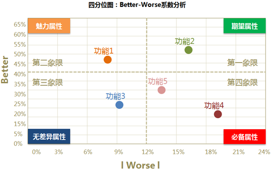 除了对于Kano属性归属的探讨,还可以通过对于功能属性归类的百分比,计算出Better-Worse系数,表示某功能可以增加满意或者消除很不喜欢的影响程度。
