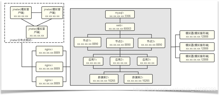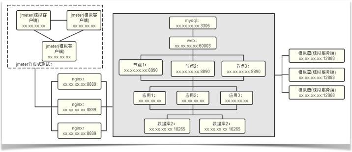 根据测试场景以及梳理的被测系统、压力系统、压力机情况、给定的服务器数量,绘制测试环境搭建图谱即每个应用系统搭建数量、各节点所在机器,如下图梳理了整个系统部署的流程及每个应用、监控工具、测试工具应该部署的机器情况,让人一目了然。
