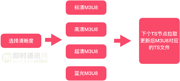首先:切片播放的特性特别适用于点播播放中视频清晰度、多语种的热切换。比如我们播放一个视频,起初选择的是标清视频播放,当我们看了一半觉得不够清晰,需要换成超清的,这时候只需要将标清的M3U8文件替换成超清的M3U8文件,当我们播放到下一个TS节点时,视频就会自动替换成超清的TS文件,不需要对视频做重新初始化。