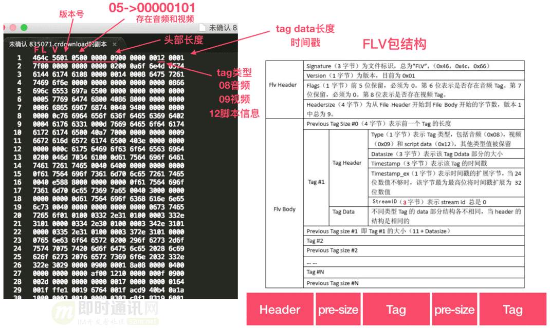 打开文件后可以读取到16进制的文件流,通过和FLV包结构对比,可以发现这些数据就是我们需要的FLV数据。