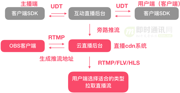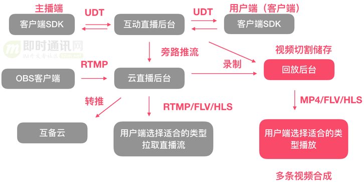 - 2)互动直播后台仅做转发:没有转码,上传CDN等额外操作,整体延迟比较低;