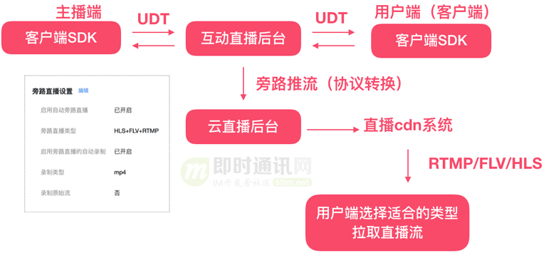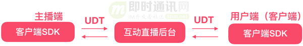 - 2)主播端通过UDT私有协议向互动直播后台推送音视频流;