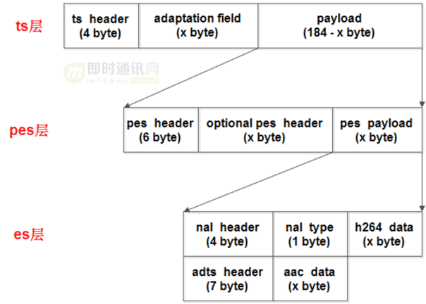 一个ts由多个定长的packtet组成,通常是188个字节,每个packtet有head和payload组成,head中包含一些标识符、错误信息、包位置等基础信息。payload可以简单理解为音视频信息,但实际上下层还有还有两层封装,将封装解码后可以获取到音视频流的编码数据。