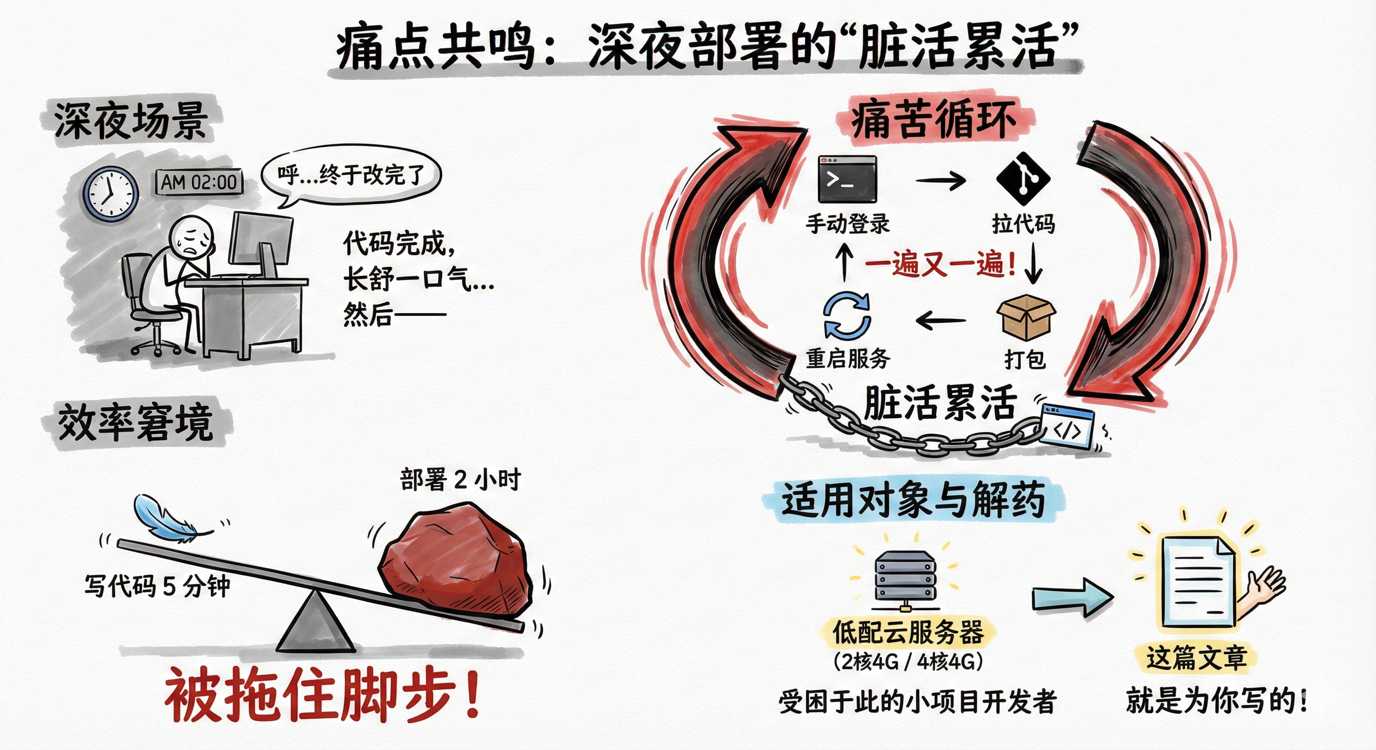 深夜改完最后一行代码,长舒一口气,然后——又要手动登录服务器、拉代码、打包、重启服务……