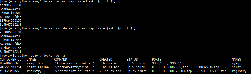 [root@k8s python-demo]# docker ps -a|grep Exited|awk '{print $1}' #查询所有的容器,过滤出Exited状态的容器,列出容器ID,删除这些容器