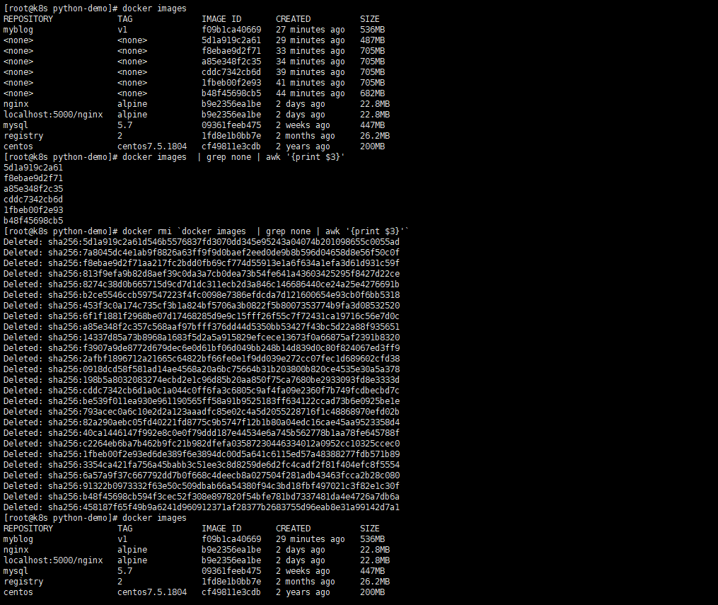 [root@k8s python-demo]# docker rmi `docker images | grep none | awk '{print $3}'`