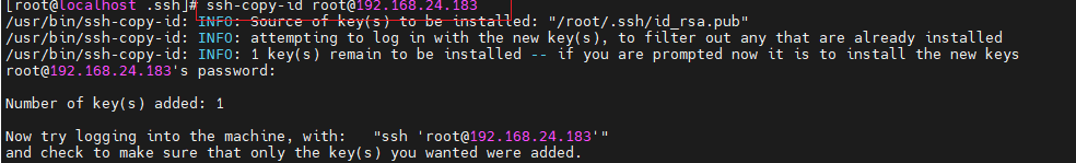 二、生成的密钥对存放在.ssh/, ssh-copy-id root@192.168.24.183和 ssh-copy-id root@192.168.24.182
