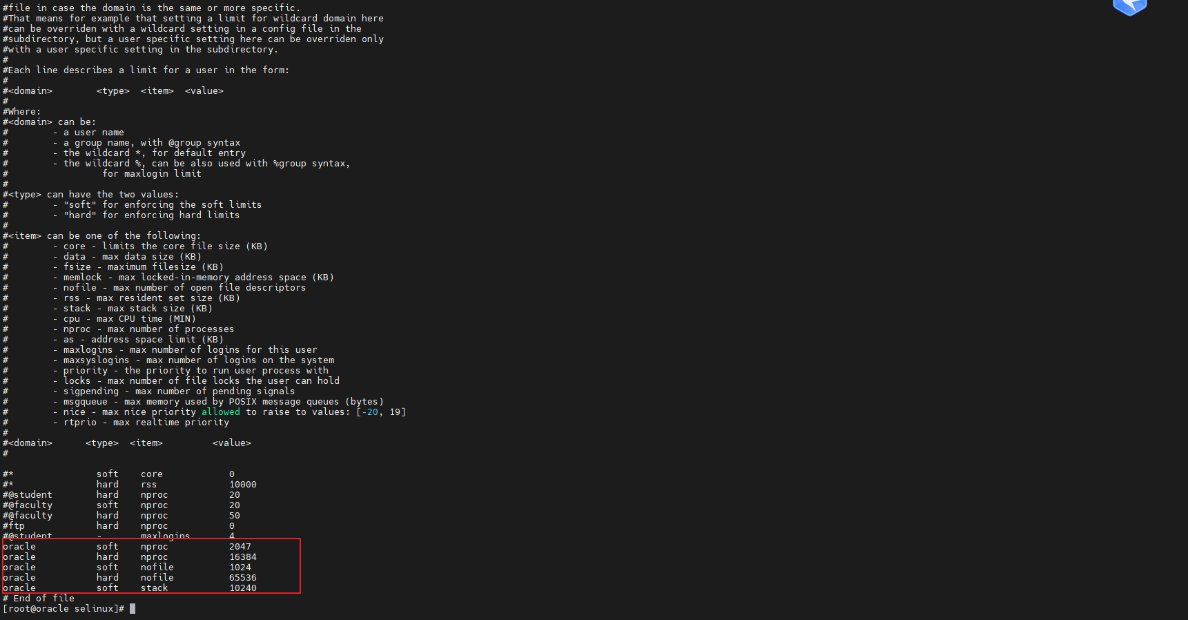 2.3 在目录/etc/security/limits.conf配置oracle用户限制文件