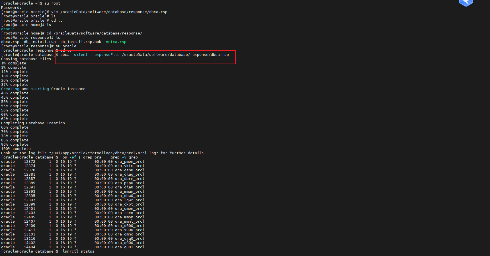 dbca -silent -responseFile /oracleData/software/database/response/dbca.rsp