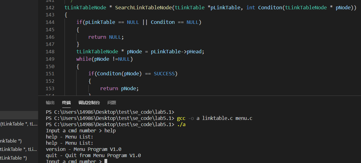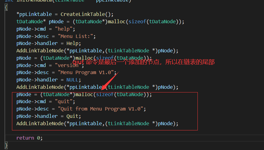 这个数据结构是本程序的核心,本程序的主要功能是在程序初试化的时候创建一系列命令的节点通过链表链接起来,当用户输入命令的时候,通过搜索相应的链表找到和节点中值相等的的节点,调用节点中的处理函数,通过链表存储节点,节点的功能是绑定命令和对应的处理函数,当用户输入命名,搜索链表就能找到处理函数,这样很方便动态添加命令和以及响应命令的的处理函数,
