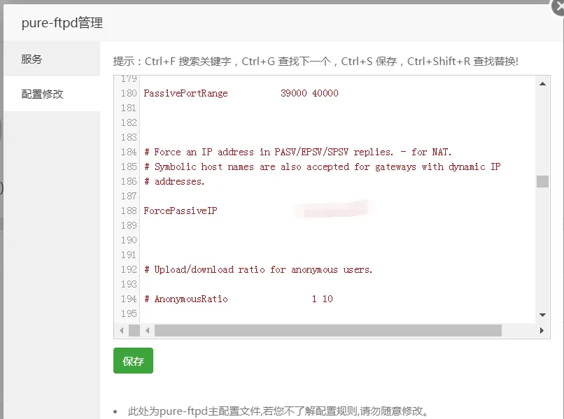 188行 ForcePassiveIP 后面改成服务器的外网IP,改完重启FTP服务器 ,就可以正常的连接了!!!