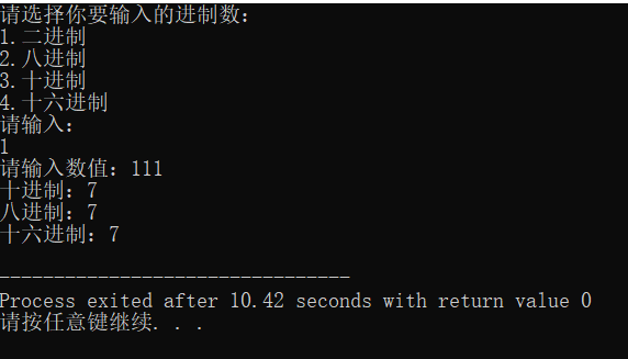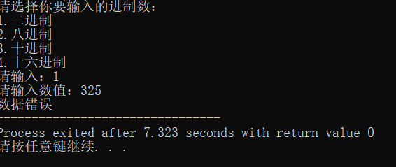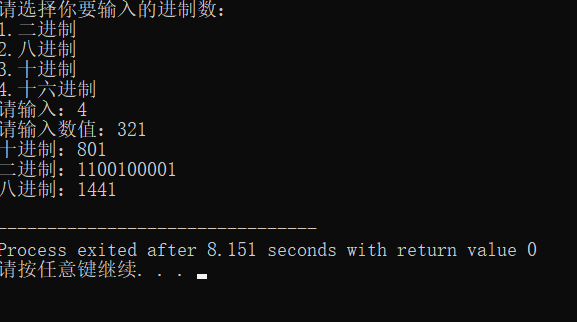 int main() { int n; long long int a; char b[100]; char c[100]; Main(); scanf("%d",&n); switch(n) { case 1: printf("请输入数值:"); scanf("%s",b); if(!Check(b,2)) //判断数据是否符合要求 { printf("数据错误"); break; } a=Change(b,2); printf("十进制:%lld\n",a); Change2(a,c,8); printf("八进制:"); Print(c); Change2(a,c,16); printf("十六进制:"); Print(c); break; case 2: printf("请输入数值:"); scanf("%s",b); if(!Check(b,8)) //判断数据是否符合要求 { printf("数据错误"); break; } a=Change(b,8); printf("十进制:%lld\n",a); Change2(a,c,2); printf("二进制:"); Print(c); Change2(a,c,16); printf("十六进制:"); Print(c); break; case 3: printf("请输入数值:"); scanf("%lld",&a); Change2(a,c,2); printf("二进制:"); Print(c); printf("八进制:"); Change2(a,c,8); Print(c); Change2(a,c,16); printf("十六进制:"); Print(c); break; case 4: printf("请输入数值:"); scanf("%s",b); if(!Check(b,16)) //判断数据是否符合要求 { printf("数据错误"); break; } a=Change(b,16); printf("十进制:%lld\n",a); Change2(a,c,2); printf("二进制:"); Print(c); Change2(a,c,8); printf("八进制:"); Print(c); break; } return 0; }