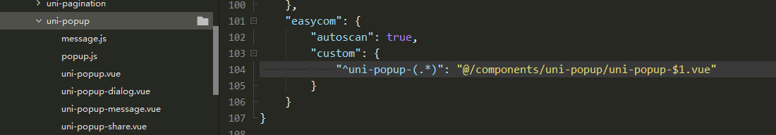 图中uni-popup组件可以被默认的easycom规则引入到项目中,但是uni-popup-dialog组件因为和文件夹名字不同所以编译之后无法找到该组件,解决办法在pages.json文件中添加easycom节点配置图中代码规则,就可以使用uni-popup-dialog组件和下面两个组件。