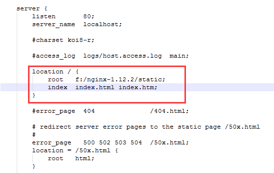 将静态资源(如jpg|png|css|js等)放在如下配置的f:/nginx-1.12.2/static目录下,然后在nginx配置文件中做如下配置(注意:静态资源配置只能放在 location / 中),浏览器中访问 http://localhost:80/1.png 即可访问到 f:/nginx-1.12.2/static目录下的 1.png图片