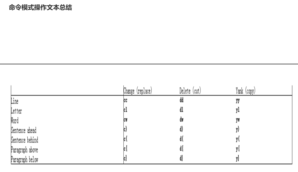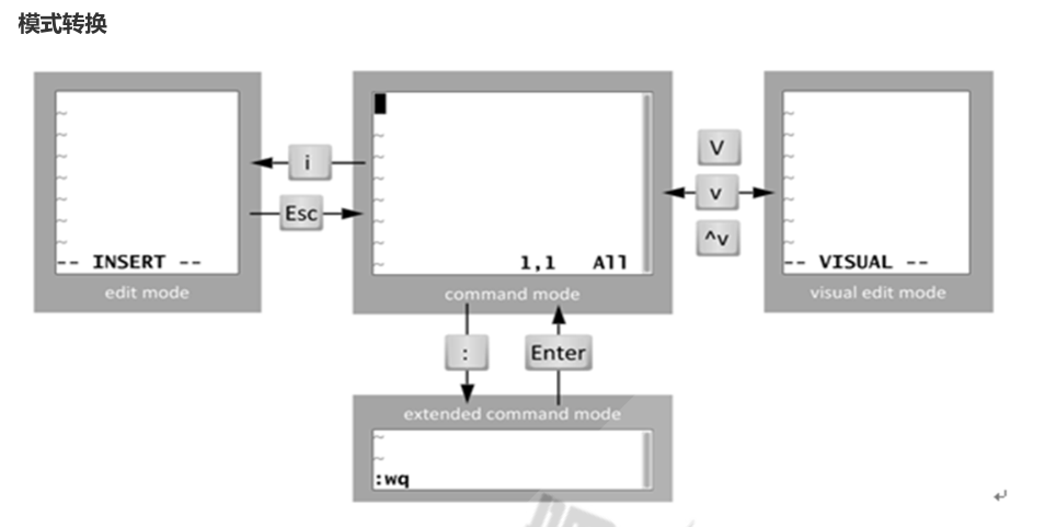 命令或普通(Normal)模式:默认模式,可以实现移动光标,剪切/粘贴文本