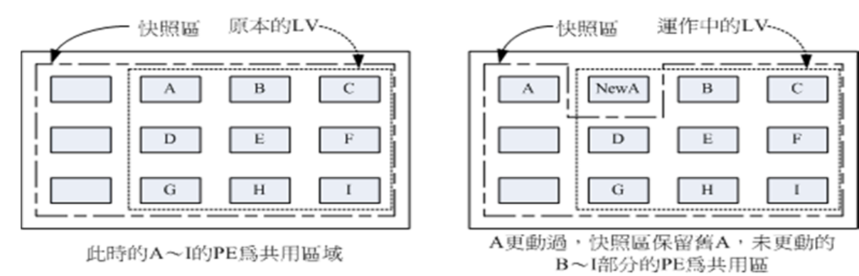 由于快照区与原本的LV共用很多PE的区块,因此快照与被快照的LV必须在同一个VG中.系统恢复的时候