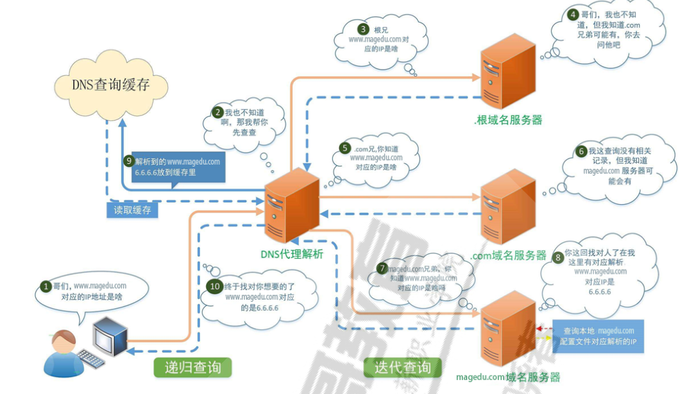 Client -->hosts文件 --> Client DNS Service Local Cache --> DNS Server (recursion递归) --> DNS Server Cache -->DNS iteration(迭代) --> 根--> 顶级域名DNS-->二级域名DNS…