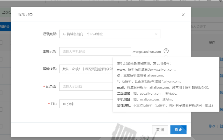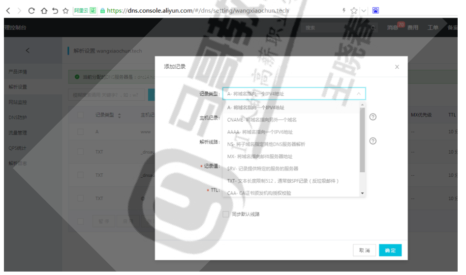 记录类型:A, AAAA, PTR, SOA, NS, CNAME, MX