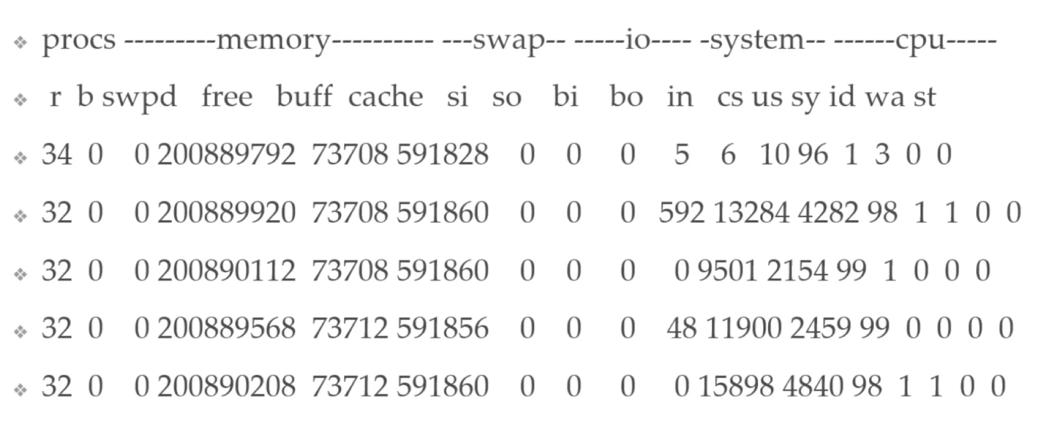 b:等待IO的进程数量,一般不怎么用;学会用man vmstat查看参数信息