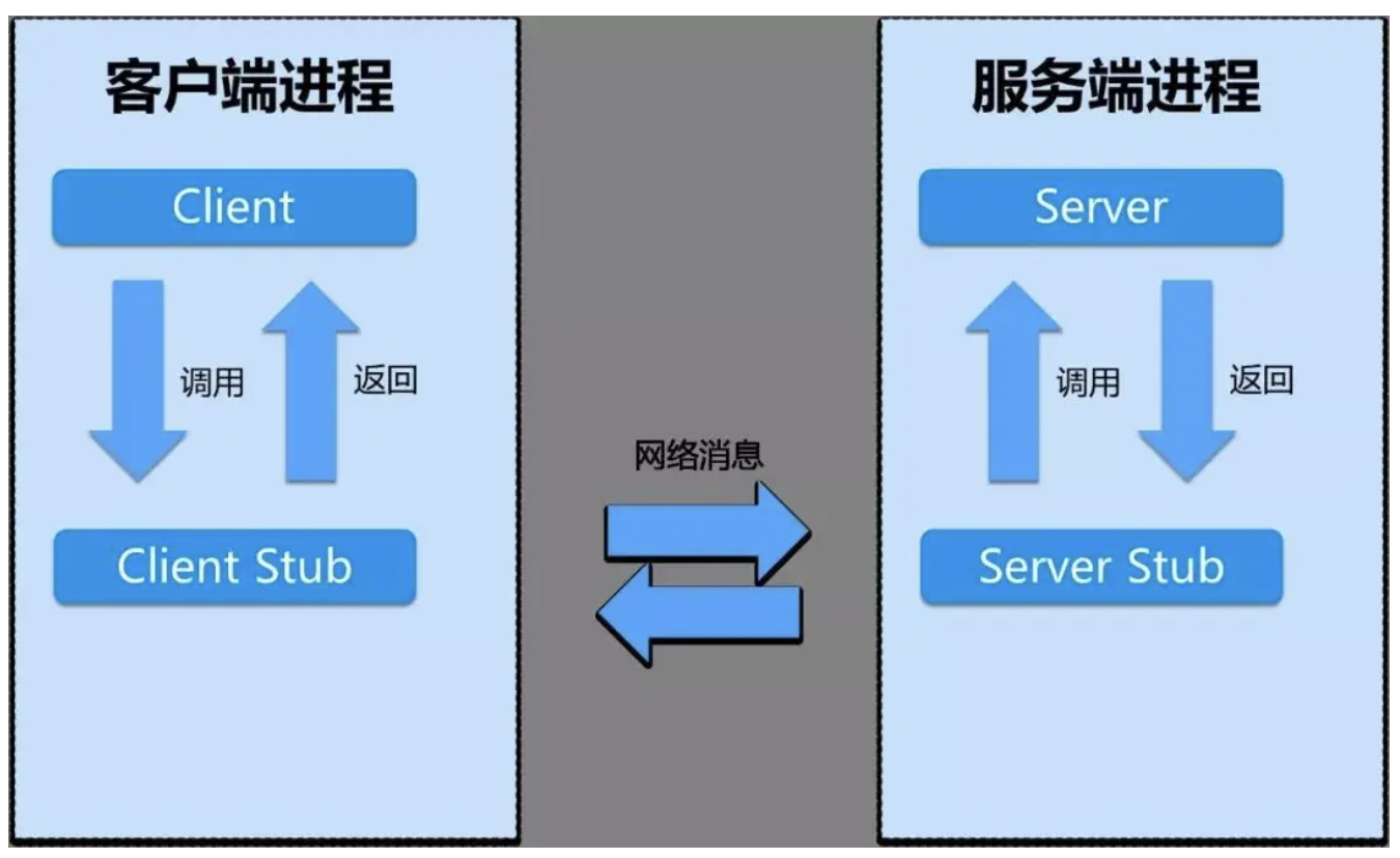 一个完整的RPC架构里面包含了四个核心的组件,分别是Client ,Server,Client Stub以及Server Stub,这个Stub大家可以理解为存根。分别说说这几个组件: