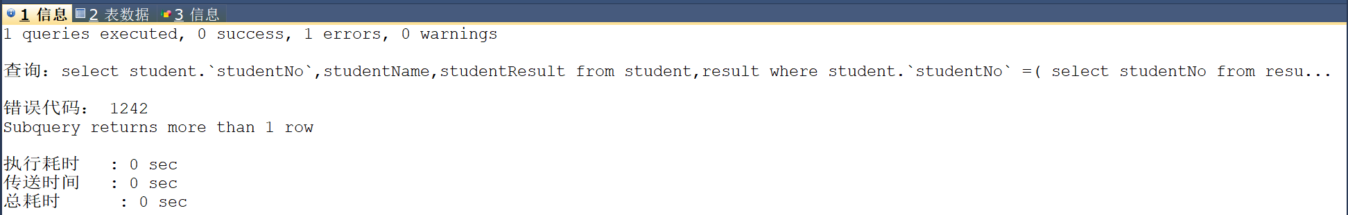 比如,以上查询考试成绩在90分以上的所有学生学号、姓名及成绩时,返回结果多余一个,便会报出错误。
