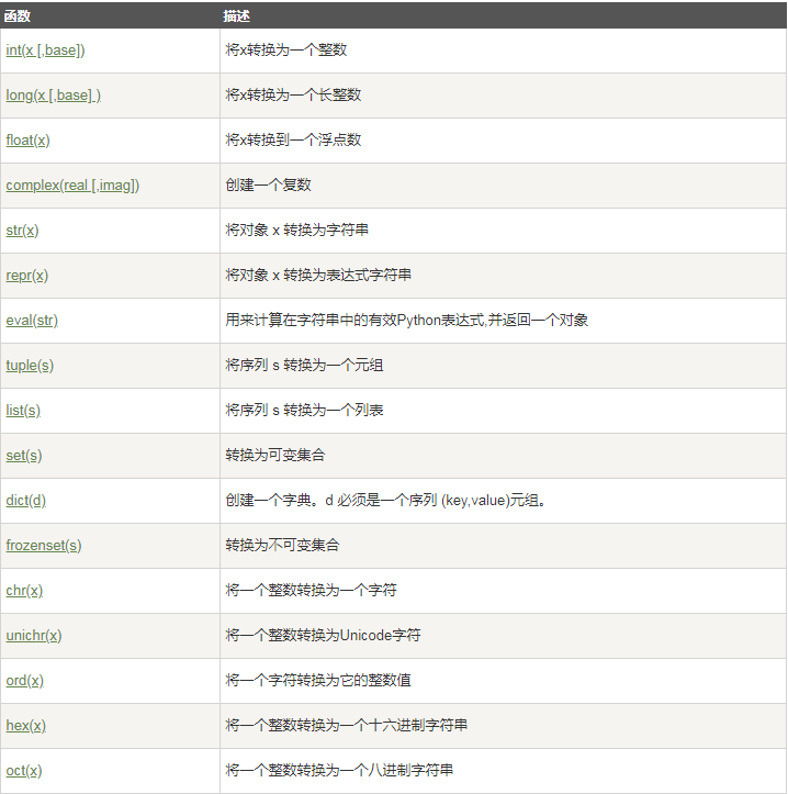以下几个内置的函数可以执行数据类型之间的转换。这些函数返回一个新的对象,表示转换的值。