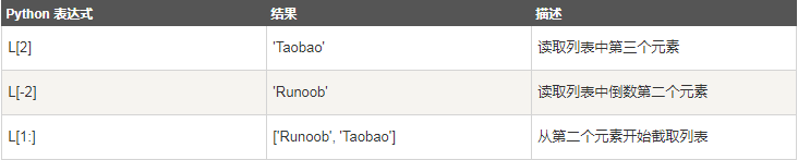 >>>L = ['Google', 'Runoob', 'Taobao'] >>> L[2] 'Taobao' >>> L[-2] 'Runoob' >>> L[1:] ['Runoob', 'Taobao'] >>>