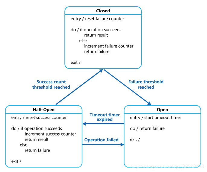 代理可以实现为具有以下状态的状态机,这些状态可以模拟断路器的功能: