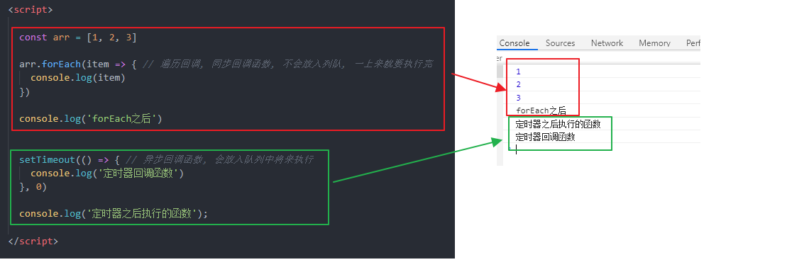 理解: 立即执行, 完全执行完了才结束, 不会放入回调队列中