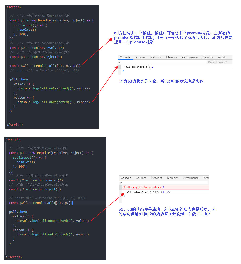 说明: 返回一个新的promise, 只有所有的promise都成功才成功, 只要有一个失败了就直接失败