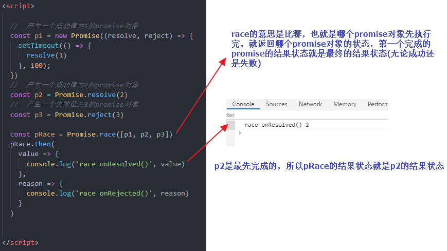 说明: 返回一个新的promise, 第一个完成的promise的结果状态就是最终的结果状态