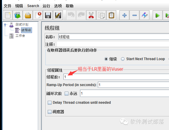 2.2线程组界面(这个界面主要是用于性能测试用,这里主要讲接口自动化,就不多讲了)