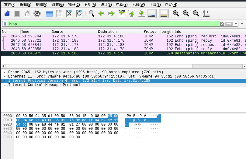 通过过滤器搜索icmp,可以定位ICMP协议对应的Ping扫描,实现两次Ping扫描。