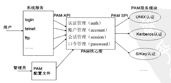 为了能够给不同的应用软件、网络服务提供统一的身份认证机制,Linux系统中提供了PAM作为一种验证用户身份的灵活与标准方法。PAM通过提供一些动态链接库和一套统一的API,将系统提供的服务和该服务的认证方式分开。系统管理员通过PAM配置文件来制定身份认证策略。而PAM服务模块的开发者则利用PAM SPI来编写认证模块。PAM核心库则读取配置文件。PAM支持的四种管理界面如下: